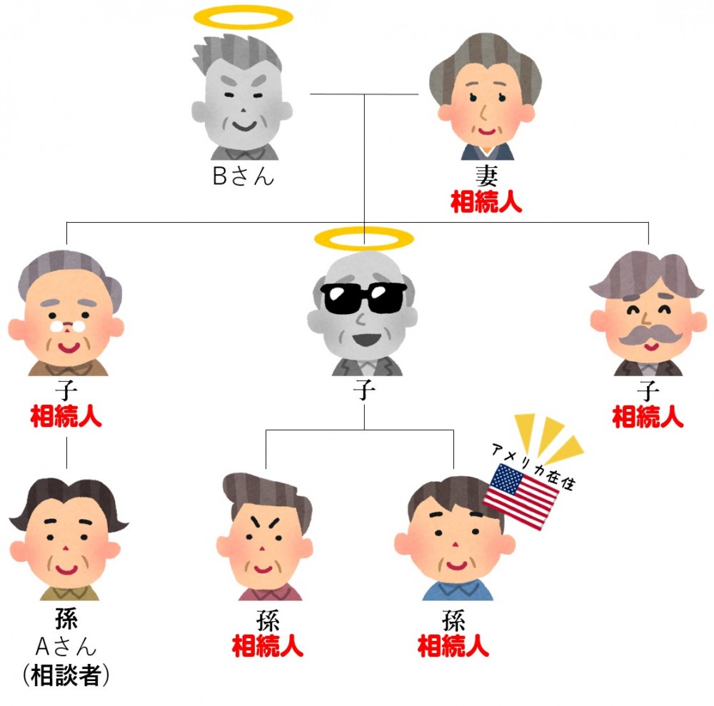 お話を伺うと相続人はBさんの妻と子供3人の計5人。Aさんのお父さんが存命ですのでAさんは相続人にはなりません。