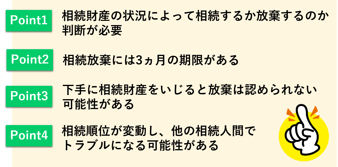相続放棄とは、被相続人の残した財産や借金を引き継ぐ権利がある相続人が、それら財産や借金を「相続しません」と宣言することです。
