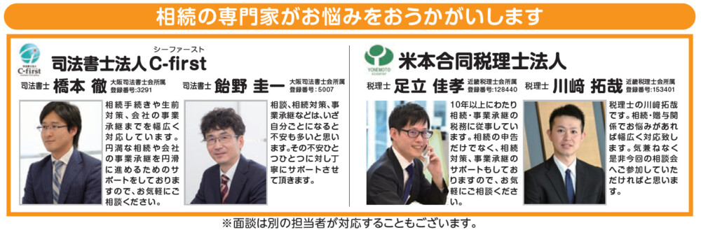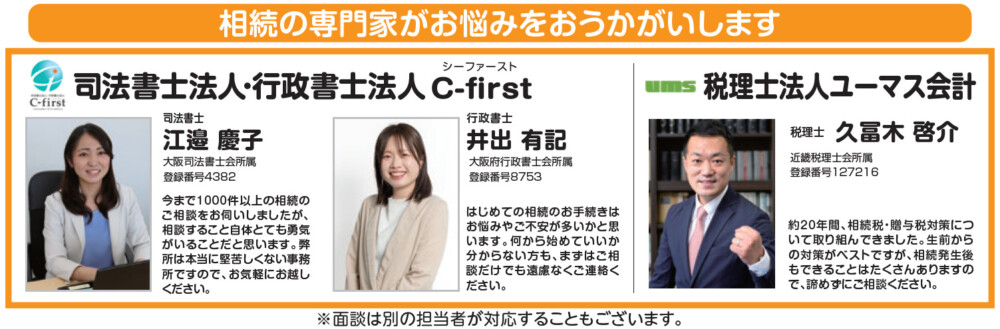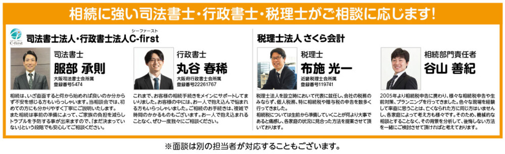 司法書士法人C-first では、こうしたお悩みをお持ちの方のために「相続の無料相談会」を開催します。相続手続きについて、相続の専門家がご家族の状況に合わせて分かりやすくご説明し、安心して手続きを進められるようサポートいたします。